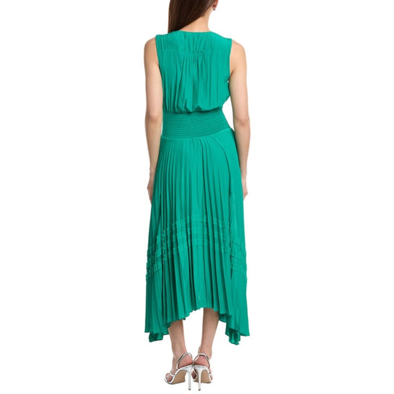 Elevate your wardrobe with the stunning Ramy Brook Livia Maxi Dress in Sea Green. This luxurious dress features a V-neck, smocked detailing, and a pleated skirt for a sophisticated and elegant look. Made from 100% polyester, this dress is both comfortable and stylish. The slip-on styling makes it easy to wear, while the vibrant color and flowing silhouette make a statement. Perfect for a special occasion or a night out, this dress is sure to turn heads. Dry clean only. Imported. Model is 5’9 and is wearing a size small. Measurements may vary slightly by size. Ramy Brook is known for its silk fabrics, lively colors, and sophisticated silhouettes, making this dress a must-have addition to your wardrobe.