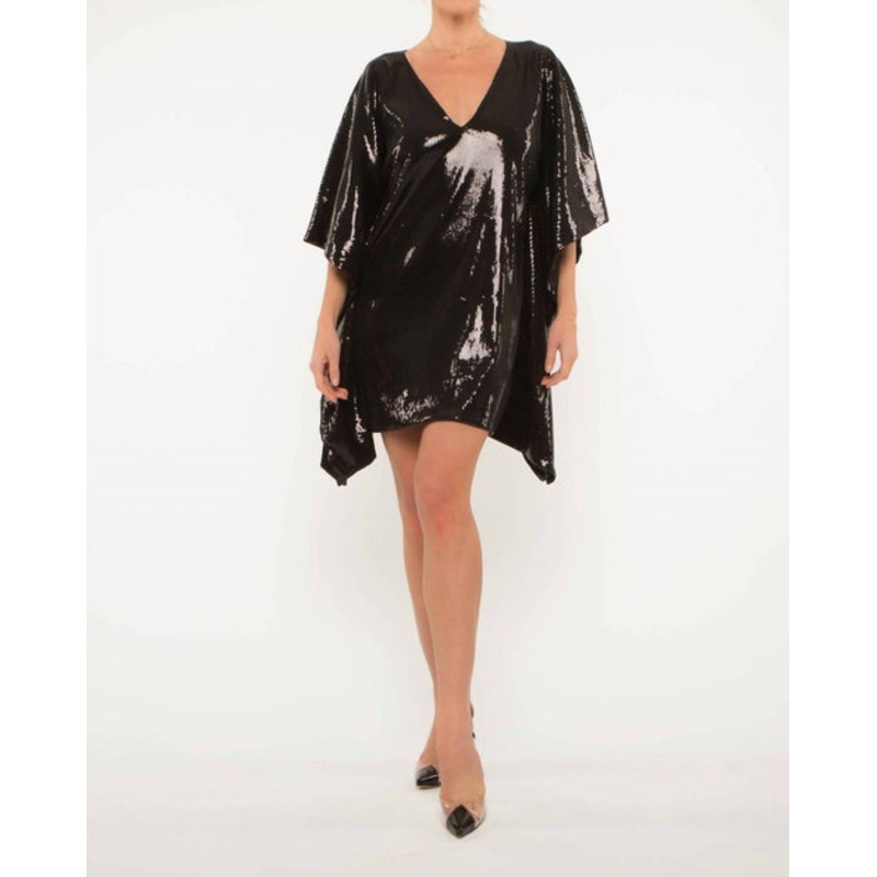 A cool twist on a classic style dress.Elevate your wardrobe with the Sequin Caftan by RIPLEY RADER, an asymmetrical dress with a textured pattern. Designed with elbow-length sleeves, this kaftan-style piece boasts a luxurious sequin exterior lined with 92% viscose and 8% stretch microfiber for ultimate comfort. Proudly made in Los Angeles, the black caftan features a pull-on closure and falls gracefully at a 34″ length. For best care, dry clean only to maintain its chic appearance.